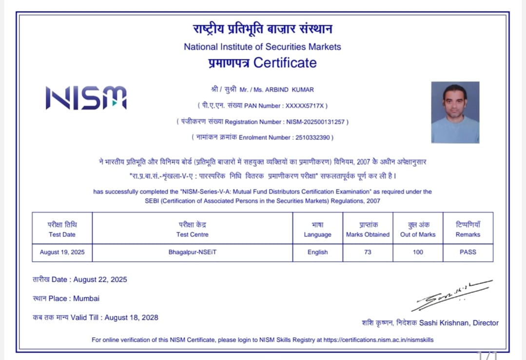 Arbind Kumar, Commerce Graduate and MBA (Finance), brings over 10 years of experience in accounting, taxation, and financial planning. He is an AMFI Registered Mutual Fund Distributor (ARN Holder) and has completed Mutual Fund Sales Certification, Soft Skills Training, and Basic Financial Education programs. He works closely with individuals, families, and businesses to provide structured, goal-oriented financial guidance.